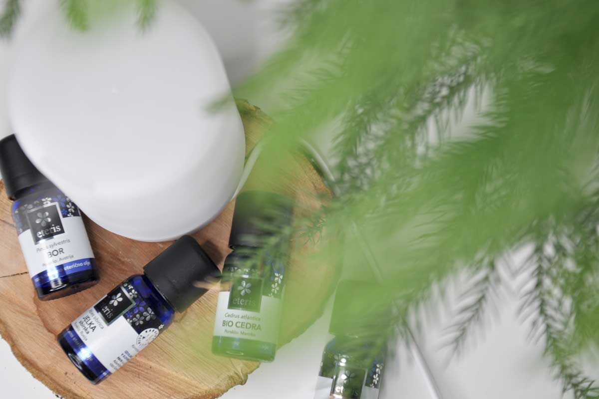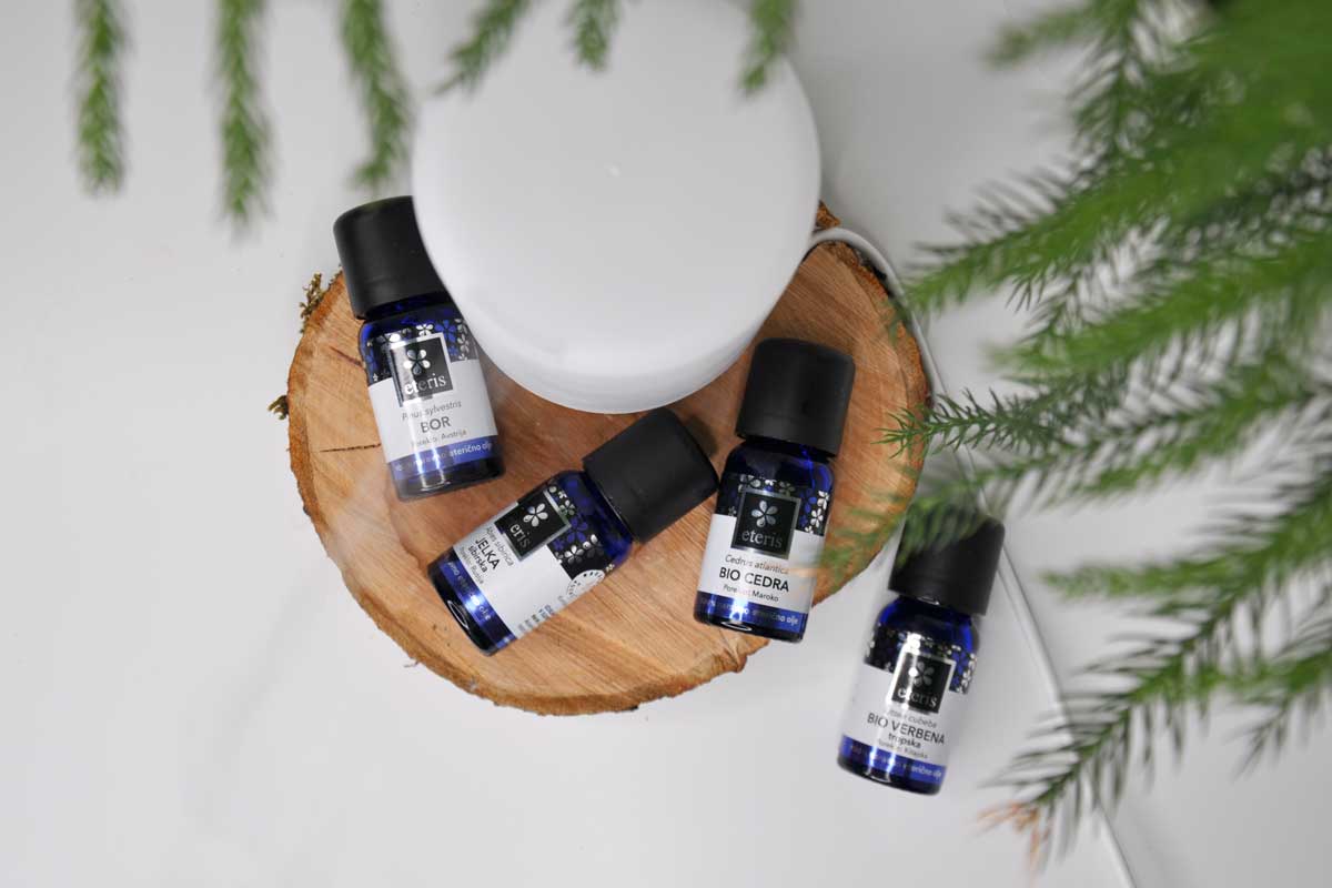 Eterična olja Eteris se meni obnesejo super. So cenovno prijazna, kupim jih lahko skoraj kjerkoli. Vedno imam na zalogi več različnih, ki jih med seboj običajno tudi mešam. To so: bor, jelka, smreka, cipresa, limonska trava, čajevec, verbena in sivka. Z izjemo sivke, se vsa ostala našteta olja med seboj lepo kombinirajo.
