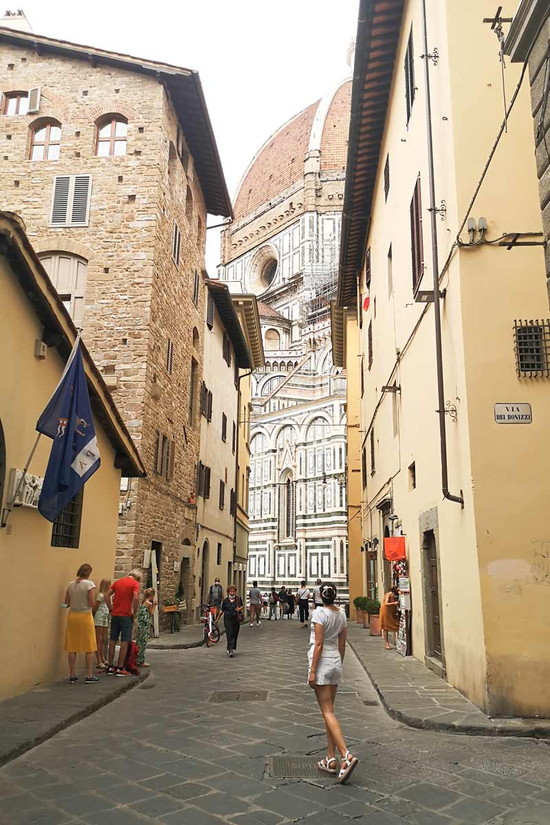 Center Firenc je ravno prav velik za dnevni izlet, če nimate namena obiskovati muzejev in cerkva. Ponuja obilico raznolike hrane, turistične točke, skrite pristne kotičke, espresso za 1,30 € in espresso za 5 €. Za vse se nekaj najde. Zaradi vseh detajlov in velikosti me je fascinirala firenška stolnica Cattedrale di Santa Maria del Fiore, ki je zgrajena v gotskem slogu. Nisva imela želje po ogledu notranjosti, kar pa ne morem trditi za večino drugih turistov, saj se je vrsta za vstop vila okoli katedrale in ni ji bilo videti konca. Še ena od kljukic je bil Stari most- Ponte Vecchio. Na tem mestu naj bi stal že v rimskih časih. V srednjeveških časih je dobil izgled pozidanega mostu, kjer so trgovci imeli svoje trgovine in celo svoja stanovanja. Sedaj je most poln zlatarn in trgovin s spominki. Mislim, da ima več čara ob gledanju od daleč kot ob sprehodu čezenj. To je tudi edini most v Firencah, ki med 2. svetovno vojno ni bil porušen.