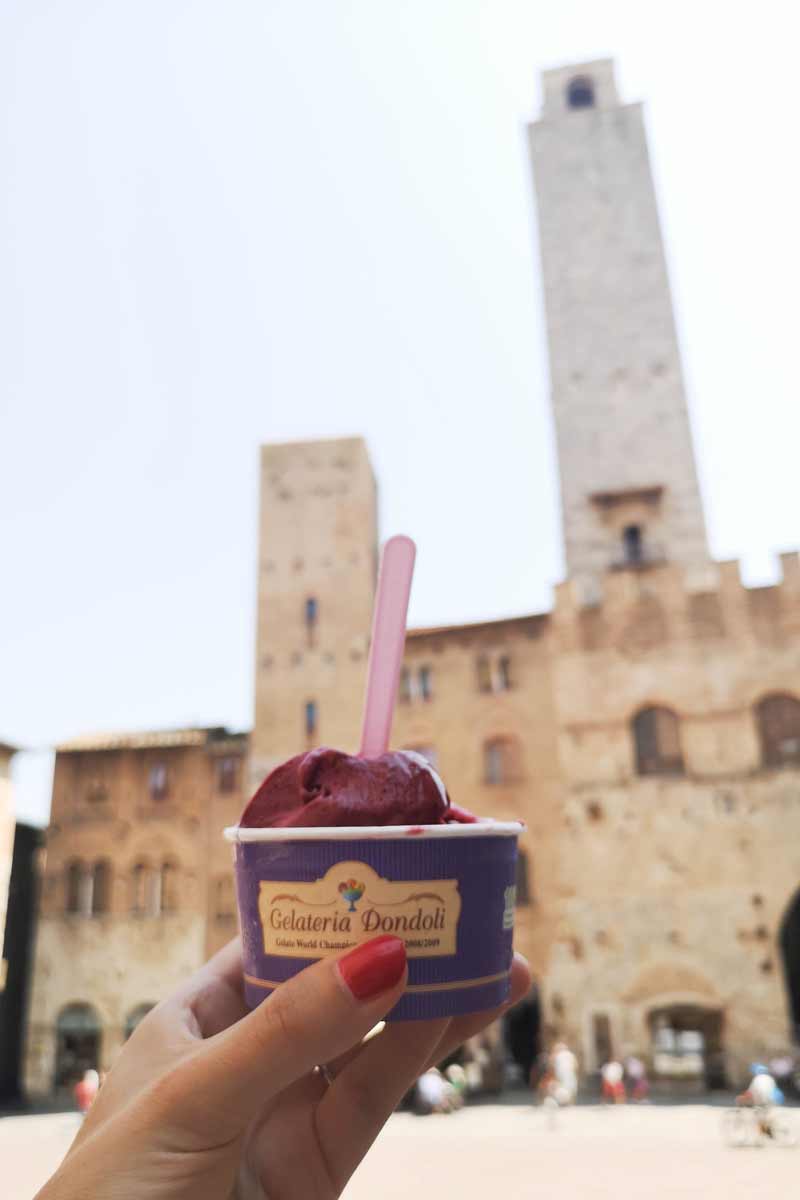 Tokrat sva se odločila za ponovni obisk San Giminjana. Trije razlogi, a zadostila sva samo enemu. Prvi razlog: preveriti, ali je »najboljši sladoled na svetu« res najboljši (za naju). Drugi razlog: kos pizze v pekarni pred obzidjem San Giminjana. Tretji razlog: zimski San Giminjano je bil tako simpatičen, da sva ga želela videti še v poletni vročini. Pice nisva jedla, ker sva bila preveč sita, tudi mestece zaradi množice turistov ni bilo tako idilično. Sva si pa privoščila sladoled, a za naju »ta najboljši« ni bil zmagovalni tega dopusta. Ta dan sva bolj uživala v panoramski vožnji, sendviču na poti, ki so nama ga naredili v res ljubki trgovinici/baru in popolnoma »nepoznanem« mestu Certaldo Alto. Zelo podoben San Giminjanu, le precej manjši in bolj pristen. Tak, za krajši sprehod, za čudovite fotografije, za aperitivo ali za ležerno branje knjige.